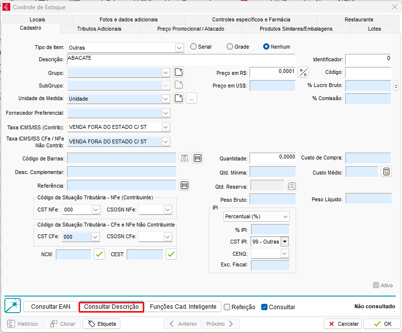 Informe a descrição da mercadoria que deseja cadastrar e clique na opção Consultar Descrição localizada na parte inferior esquerda da tela.