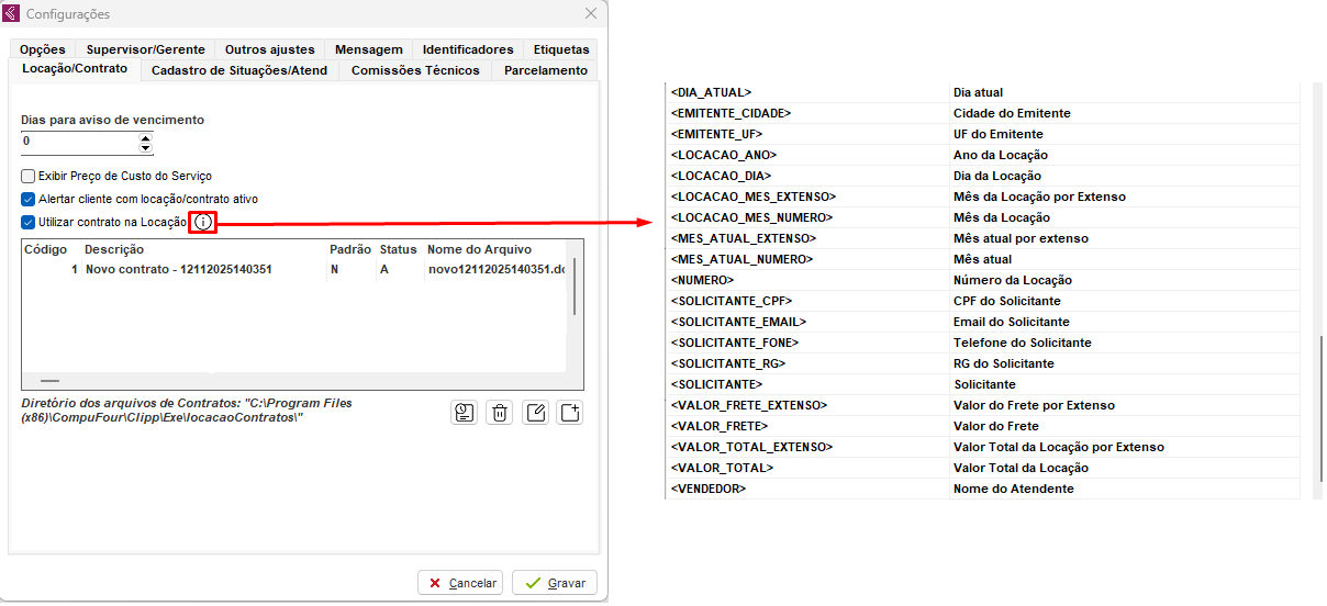 Cada informação da locação pode ser adicionada no contrato a partir da devida tag, localizada pelo botão