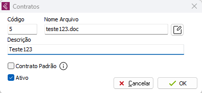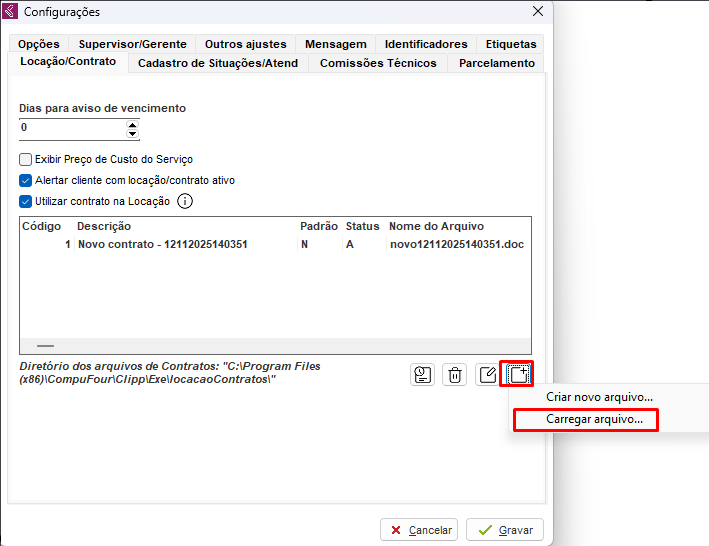 Carregue o contrato para o sistema, defina a Descrição e caso deseja que o contrato seja o padrão.
