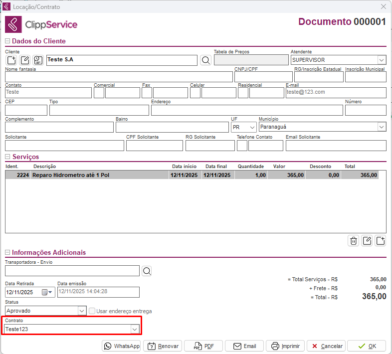 Realize uma locação e defina o contrato cadastrado na aba Informações Adicionais.
