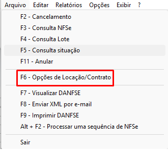 Em seguida, clique no botão Arquivo - F6 Opções de Locação e Contrato;