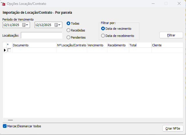 Caso o sistema localize locações com status finalizado e com criação de parcelas (finalização com faturamento diferente de nenhum), irá retornar na tela a relação dessas locações, você poderá utilizar os filtros para localizar qual deseja importar: