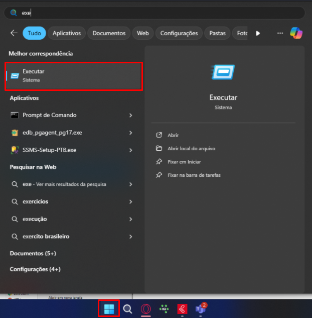 + R ou clique no botão iniciar do Windows, digite a palavra EXE e clique no aplicativo Executar;