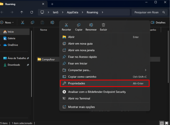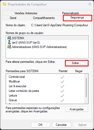 Localize a pasta CompuFour, clique com o botão direito nela e em seguida, em Propriedades;