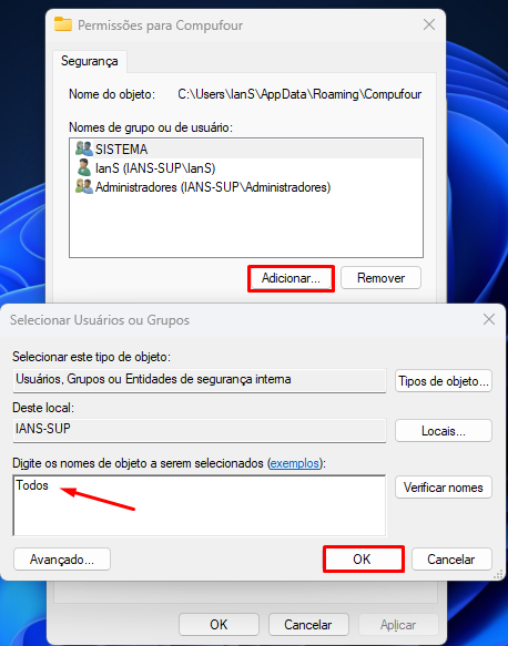 Na tela que abrir clique em Adicionar e digite o nome de usuário Todos, em seguida clique no OK para confirmar;