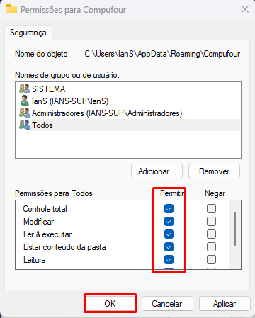 Em seguida marque a opção Controle Total (Permitir) e depois clique em Aplicar, aguarde definir e após clique no OK.