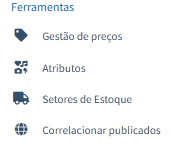 Na aba Ferramentas, é possível definir uma tabela de preços para anúncios, cadastrar e ajustar atributos de todos os itens, atribuir um local de estoque específico para cada produto e correlacionar produtos já existentes em marketplaces com os cadastrados no sistema.