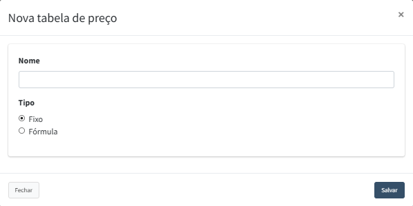 Preencha o nome da tabela de preço, e abaixo, duas informações serão apresentadas.