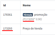 A fórmula utiliza o preço da tabela 173293 e multiplica (*) por 0.90. Supondo que o preço do produto tenha sido R$112, o sistema fará 112 * 0.9 = 100,80