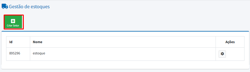 Em Setores de Estoque, clique no botão Criar Setor.