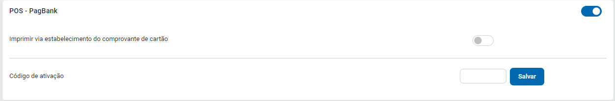 Ative a opção de POS - PagBank, será solicitado o Código de Ativação do cliente.