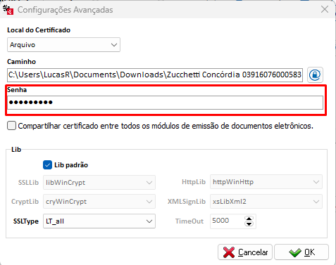 Após selecionar o certificado desta forma, desmarque a opção Lib Padrão e selecione libOpenSSL nos campos SSLib, CryptLib e httpWinHttp.