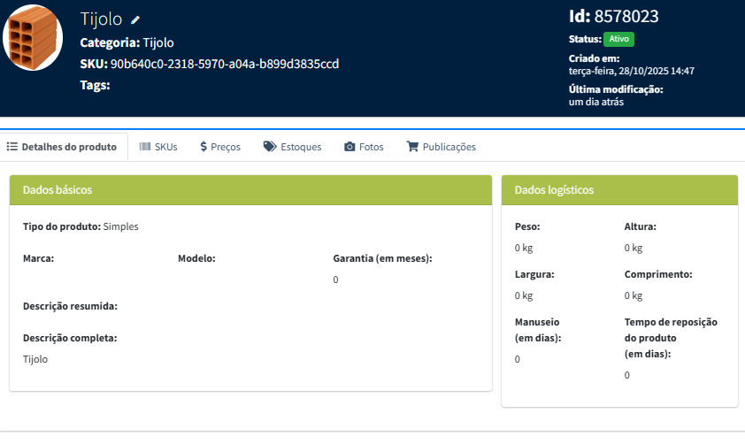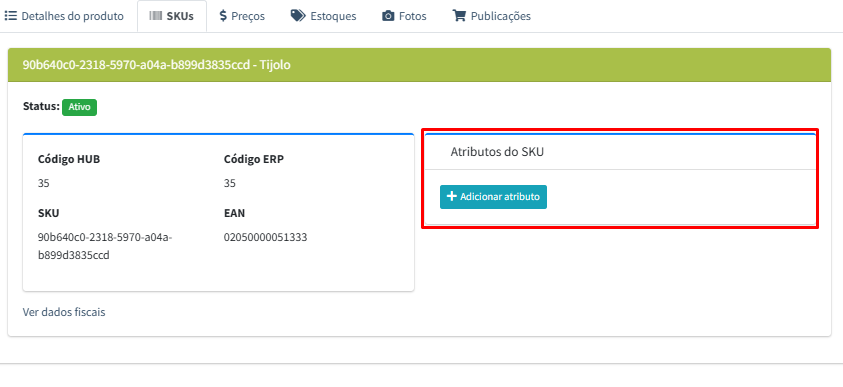 SKUs: Informações de códigos do produto, de barras podem ser visualizados, atributos também podem ser definidos pelo menu clicando aqui.