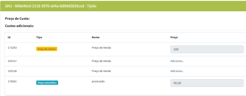 Preços: Mostra o preço cadastrado no Zweb, também permite adicionar um novo valor em outro ID conforme cadastrado na Gestão de Preços;