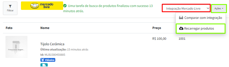 Na direita, localize a integração > Ações > Recarregar produtos os produtos do Marketplace irão ser carregados no portal