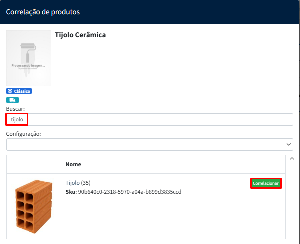 Digite o nome do produto referente ao Zweb e pressione em correlacionar, assim o anúncio do marketplace ficará relacionado ao produto do portal.