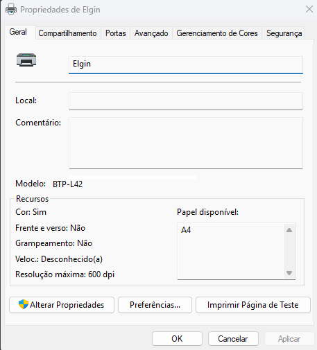 Após localize a impressora Elgin BTP-L42 > Clique com o botão direito do mouse sobre a mesma > Propriedades da Impressora > Geral > Alterar Propriedades e altere o nome da impressora para Elgin. Deve ser um nome curto e sem caracteres especiais conforme é indicado na imagem a seguir.