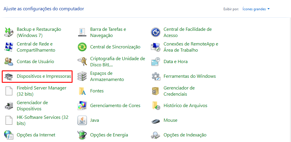 Clique no menu Iniciar do Windows / Painel de Controle / localize o ícone Dispositivos e Impressoras (conforme indicado abaixo) e clique no mesmo.