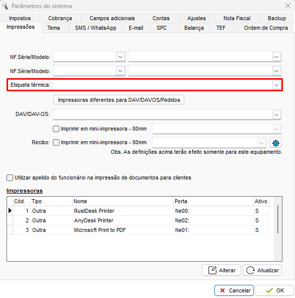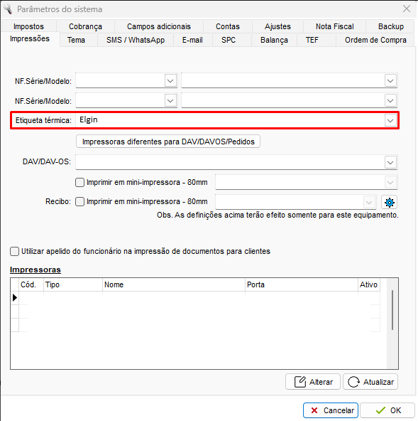 Se sim, clique na guia Impressões / na opção Etiqueta Térmica selecione a impressora Elgin e clique em OK.