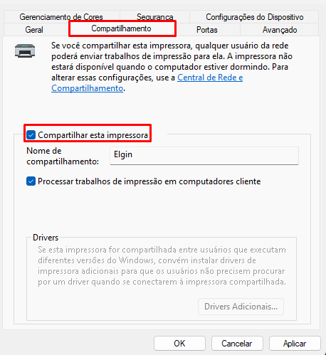 Após clique na guia Compartilhamento, se a impressora ainda não estiver compartilhada clique na opção Compartilhar esta impressora e na opção Nome de Compartilhamento deixe Elgin também, como destacado a seguir.