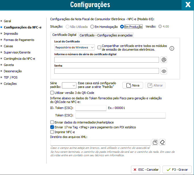 Palavras chave: selecionar certificado digital, configurar certificado. instalar certificado. DadosPFX, ArquivoPFX ou NumeroSerie não especificados !