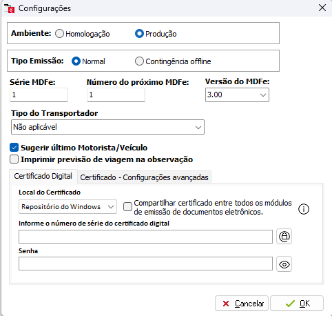 Para configurar o certificado digital no emissor de MDF-e, clique em Opções - Configurar.
