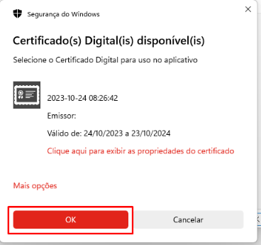 Abrirá a tela para selecionar o certificado digital, clique sobre o certificado correto e em seguida no botão OK.
