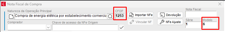 - Nota de Energia Elétrica - CFOP com terminação de 251 à 257, mais usado 253 (Compra de energia elétrica por estabelecimento comercial). Modelo 06 ou 66;
