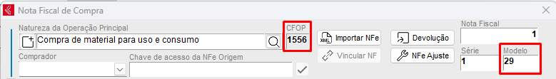 Para criar a nota, acesse o sistema Clipp Store / abra o módulo de Compras / clique no botão Novo / defina o número e a série da mesma / após informe o modelo conforme sua necessidade e conforme especificado acima. Informe também a natureza de operação desejada com base nas informações fornecidas pelo contador da empresa.