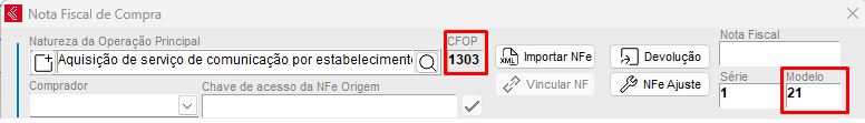 - Nota de Serviço de Comunicação - CFOP com terminação de 301 à 306, mais usado 303 (Aquisição de serviço de comunicação por estabelecimento comercial). Modelo 21;