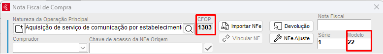 - Nota de Serviço de Telecomunicação - CFOP com terminação de 301 à 306, mais usado 303 (Aquisição de serviço de comunicação por estabelecimento comercial). Modelo 22.