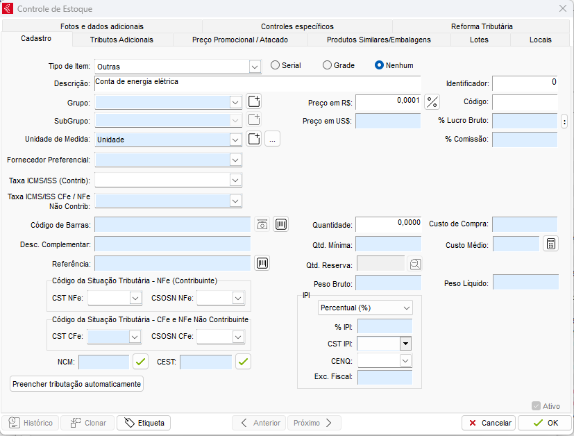 - NCM: Deve ser verificado com a contabilidade um código válido para a operação.