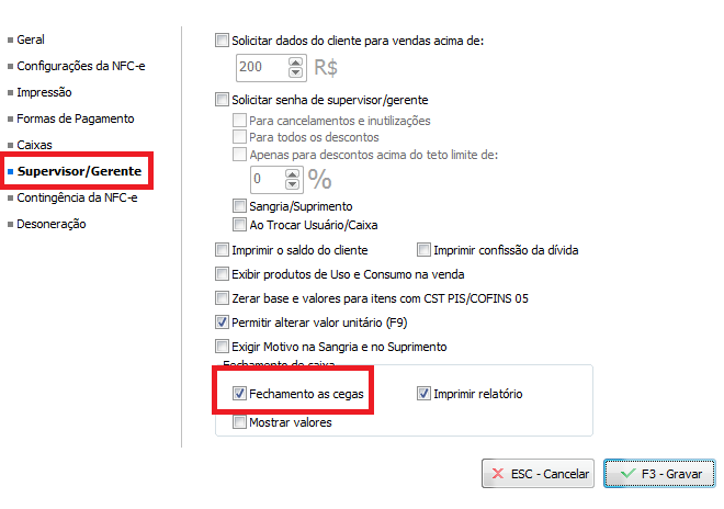 Para que o usuário do caixa não veja os valores de fechamento de caixa, acesse Configurações - Supervisor/Gerente e marque a opção Fechamento as cegas;