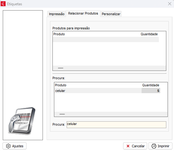 • Relacionar produtos: esta opção possibilita relacionar produtos para a impressão de etiquetas e a quantidade que será impressa;