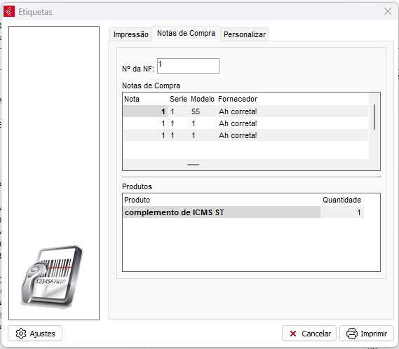 • Nota de compra: esta opção exibe a relação das notas fiscais de compra e os produtos comprados, possibilitando imprimir etiquetas e suas quantidades para os produtos desejados;