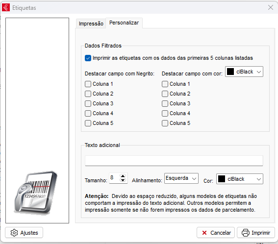 Ao selecionar a opção “Em estoque”, na guia Personalizar, ficará disponível o item “Imprimir as etiquetas com os dados das primeiras 5 colunas listadas”, ao marcar essa opção os campos que serão impressos nas etiquetas, serão as 5 primeiras colunas listadas no controle de estoque, podendo ainda definir os campos com cores diferentes e em negrito. Ainda na tela do personalizar, também estará disponível a opção de imprimir um texto adicional, onde poderá ajustar o tamanho, alinhamento e cor.