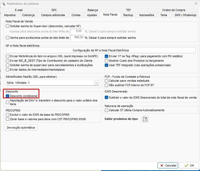 Os descontos condicionais não poderão ser subtraídos, ou seja, se tiver algum desconto na nota, esse desconto não será reduzido da Base de ICMS e do IPI (caso possua), mantendo o valor cheio.