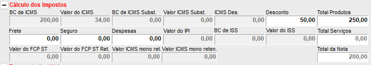 - Valor da Base de Cálculo do ICMS: 250,00