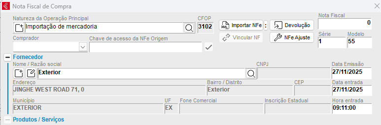 3) Informe a Natureza de Operação como Importação de mercadoria e selecione o Fornecedor criado anteriormente. Lembre-se que o CFOP de importação deve conter o número “3” no início. Para saber qual CFOP utilizar, consulte a contabilidade.