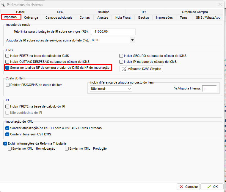 Na aba Impostos, será possível marcar a opção Somar no total da NF de compra o valor do ICMS da NF de importação.