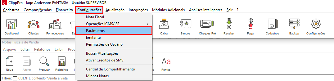Após o credenciamento junto a SEFAZ, e com o certificado digital instalado, abra seu Clipp Pro, acesse o menu Configurações e clique em Parâmetros.