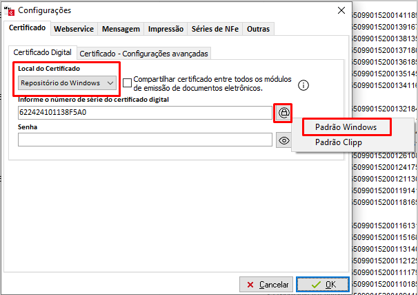 Feito isso, na direita clique em selecione a opção Padrão Windows para assim selecionar o certificado digital que a empresa utilizará para a emissão de Notas Fiscais Eletrônicas (é necessário que o certificado digital já esteja instalado no computador, lembrando que os modelos compatíveis são: A1 e A3).