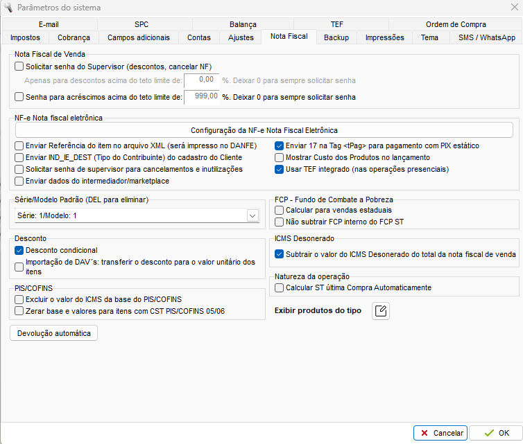 Impostos - Cobrança - Campos Adicionais - Contas - Ajustes - Nota Fiscal - Backup